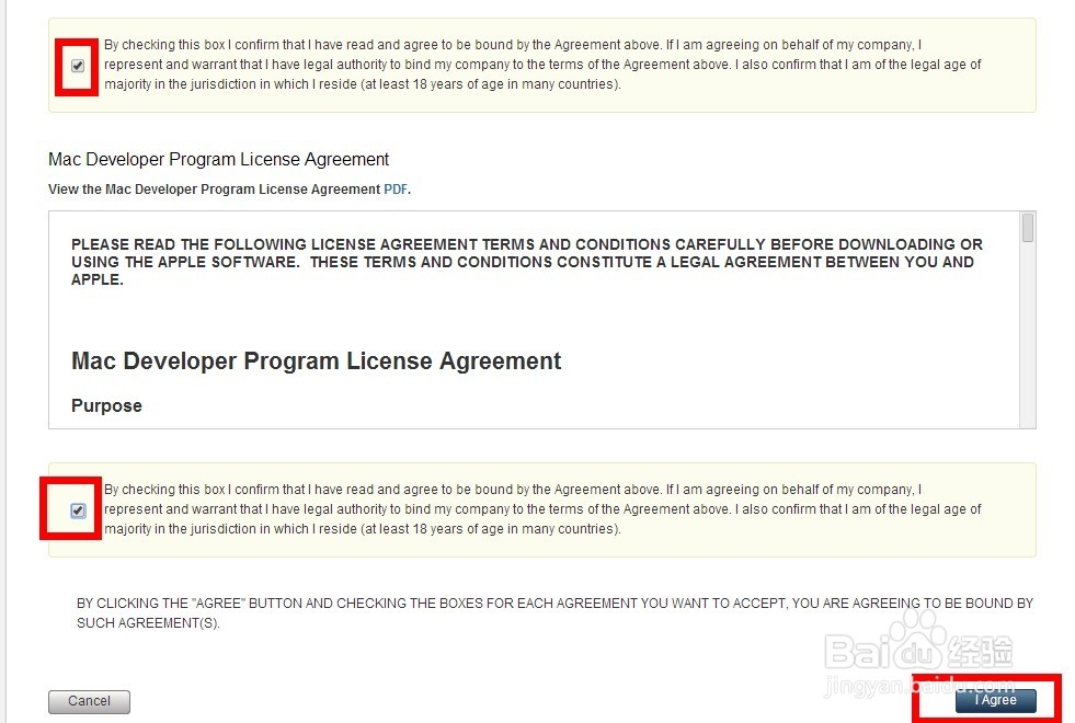 9、登陆成功后进入开发者协议页面,将同意协议的复选框勾上,点击agree(同意)按钮继续!如下图所示